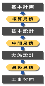 一般的には、初期段階での坪単価計算による概算見積と、工事契約前に設計図から数量を拾い出して行う詳細見積の2段階で工事費を算出することが多いようですが、弊社では、基本設計の終了時にも中間見積を行い、最後の工事契約前の見積において予算オーバーとならないようにするシステムを採っています。