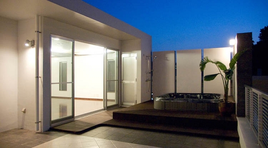 間取としては、1階に車庫と寝室となる個室群や浴室を配し、2階には広さにゆとりのあるリビングとダイニング・キッチンを配置して、来客をおもてなしするためのパブリック空間と、ゆっくりと休むためのプライベート空間を階で分けています。また、2階にはオープンテラスを造り、その一角にはジャグジーを設け、リビングとつながり、室内外が一体となったくつろぎのリゾート空間を創り出しています。