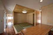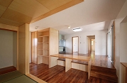敷地内の高低差が1.4m程あったので、土地なりに床に段差を設けるスキップフロアという方式を採用し、躯体などの無駄の少ない建物とすると共に、平屋でありながら立体的な室内空間を創りだしました。